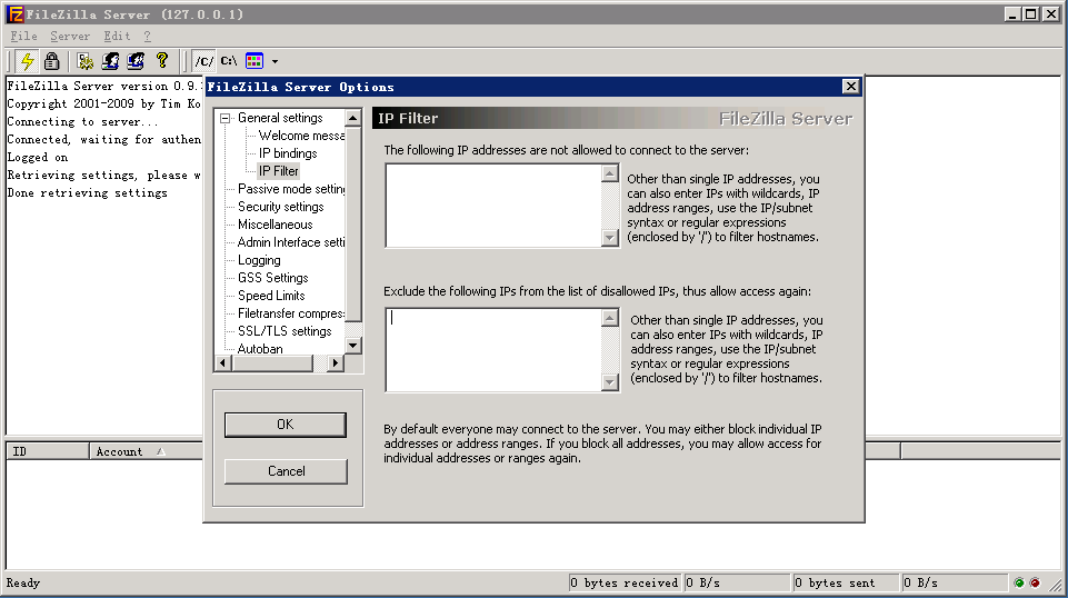 若我們需要對(duì)外開放192.168.1.0網(wǎng)段,則填寫:192.168.1.0/255.255.255.0。 注意:此處的子網(wǎng)掩碼不能使用位數(shù)表示,即FileZilla不接受“192.168.1.0/24”這種格式。6. 點(diǎn)擊OK確定,IP過濾即配置完成。