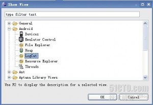 啟動Eclipse,在Window->Show View會出來一個(gè)對話框,當(dāng)我們點(diǎn)擊Ok按鈕時(shí),會在控制臺窗口出現(xiàn)LogCat視窗.如下圖: